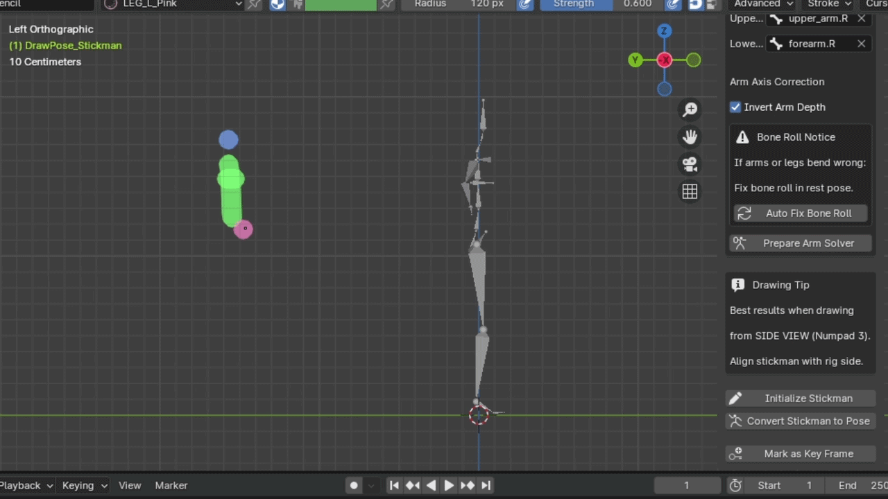 • Convert stickman drawings into 3D poses • Grease Pencil based workflow • Automatic limb direction detection • Joint bend detection (knees and elbows) • One-click pose generation • Optional correction checkboxes • "Mark as Keyframe" button for fast animation workflows